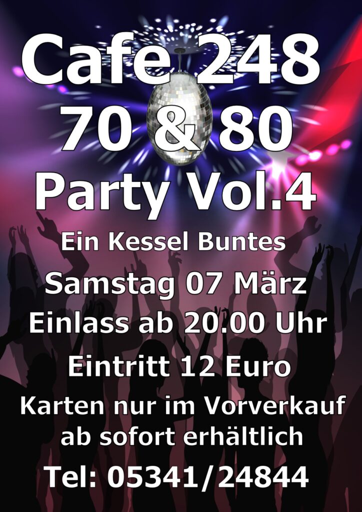 70er & 80er Party Vol.4 – Ein Kessel Buntes. Tauche ein in die glitzernde Welt der Disco-Kugeln, Schlaghosen und Synthie-Beats! Café 248 lädt dich ein zur ultimativen Zeitreise: 70er & 80er Party Vol.4 – Ein Kessel Buntes!