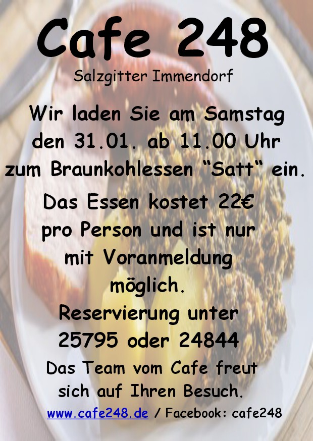 Am Samstag 01. Februar ab 12.00 Uhr gibt es nach dem tollen Erfolg im November noch mal ein Braunkohlessen „satt“. Nur auf Anmeldung unter 05341/24844. Pro Person 20.00 €. Wir freuen uns auf Ihren Besuch.
