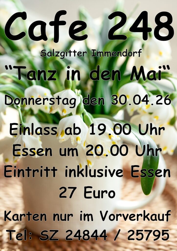 Der Mai kommt – und wir tanzen ihm entgegen! Am 30. April steigt im Café 248 unser beliebter „Tanz in den Mai“. Erst lecker essen, dann gemeinsam feiern – genau so, wie es sein soll.